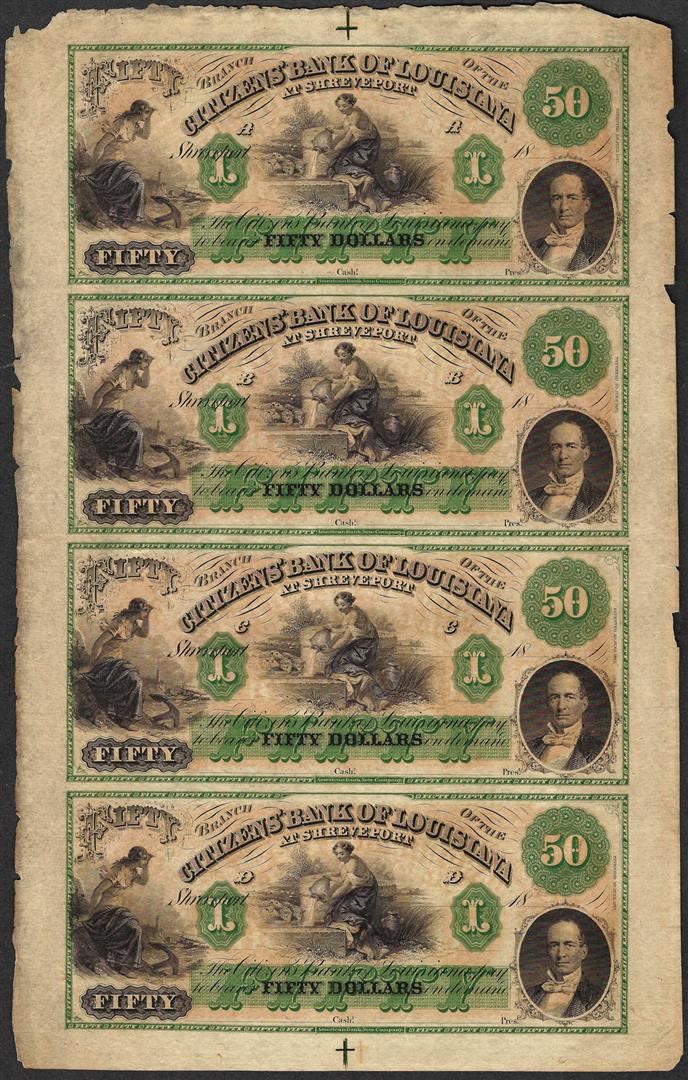 Uncut Sheet of 1800's $50 Citizens Bank of Louisiana Obsolete Notes