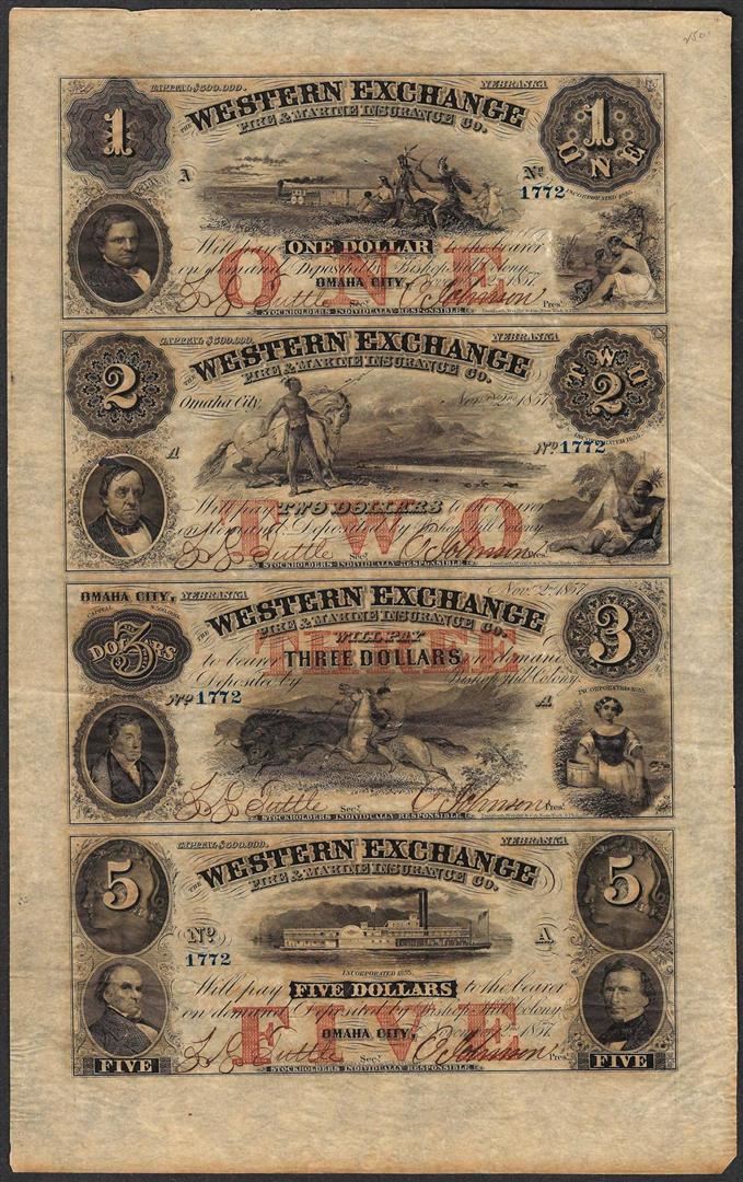 One Uncut Sheet of 1857 Western Exchange Fire & Marine Insurance Co. Obsolete Notes.