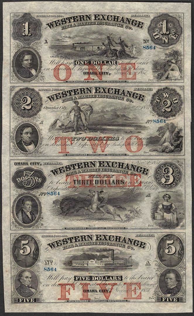 One Uncut Sheet of 1857 Western Exchange Fire & Marine Insurance Co. Obsolete Notes.