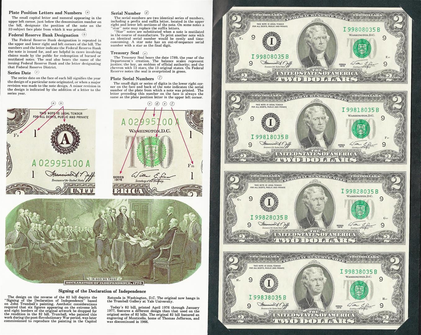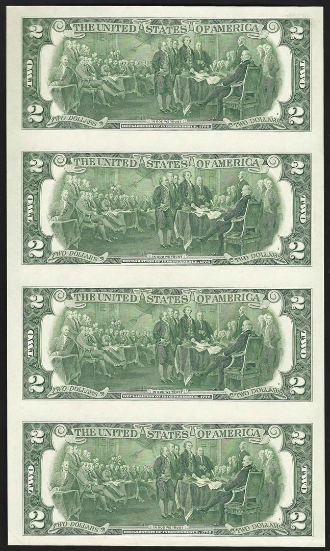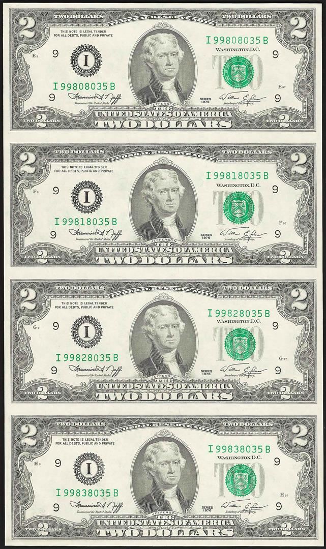 One Uncut Sheet of (4) 1976 $2 Federal Reserve STAR Notes.