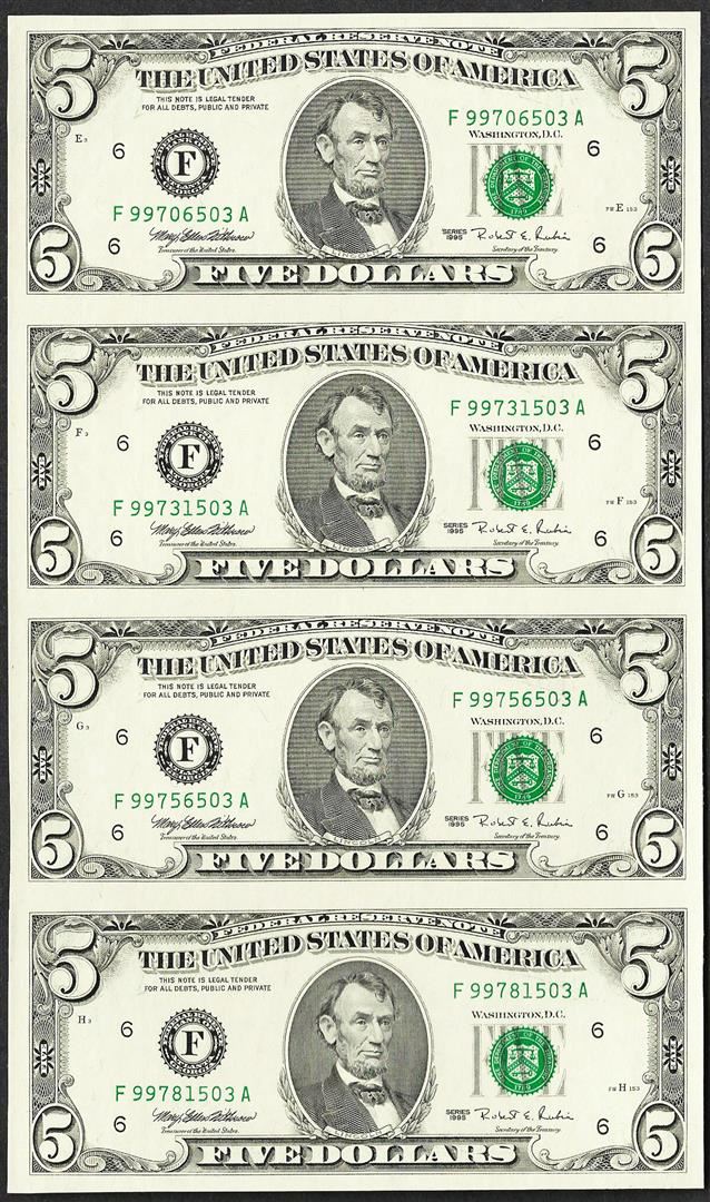 One Uncut Sheet of (4) 1995 $5 Federal Reserve Notes Atlanta.
