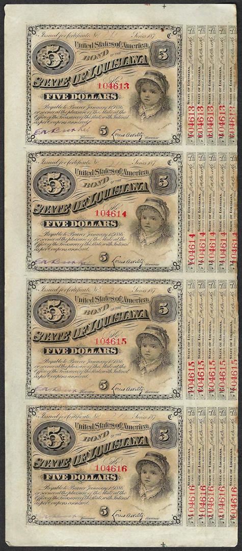 Uncut Sheet of (4) State of Louisiana Baby Bond Obsolete Notes