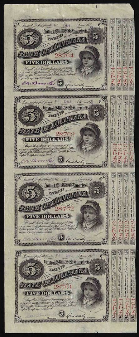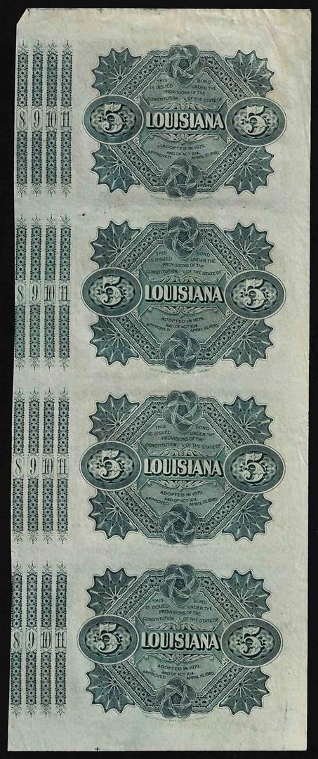 Uncut Sheet of (4) State of Louisiana Baby Bond Obsolete Notes