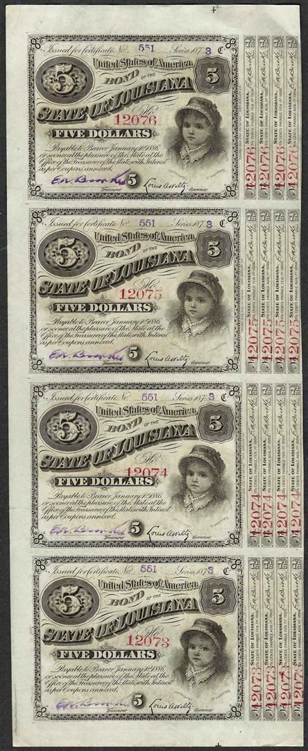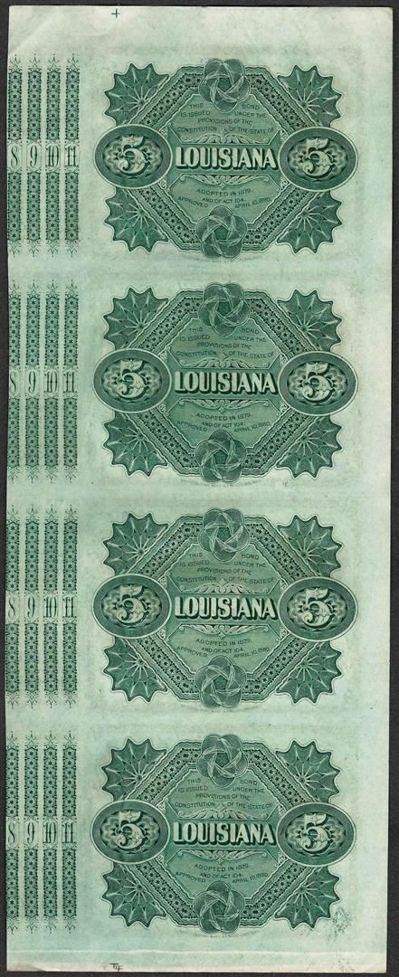 Uncut Sheet of (4) State of Louisiana Baby Bond Obsolete Notes