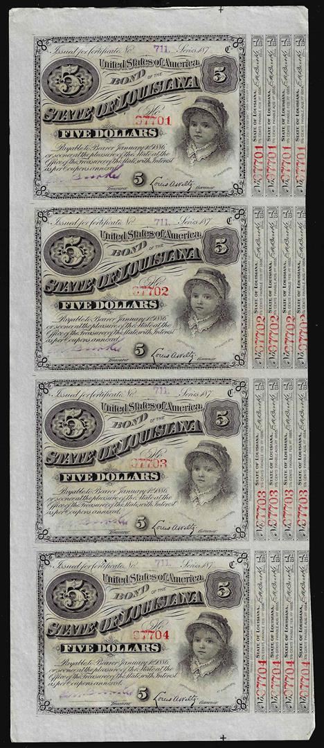 Uncut Sheet of (4) State of Louisiana Baby Bond Obsolete Notes