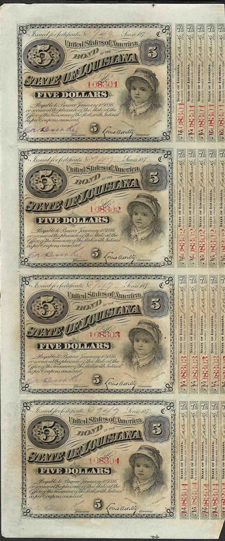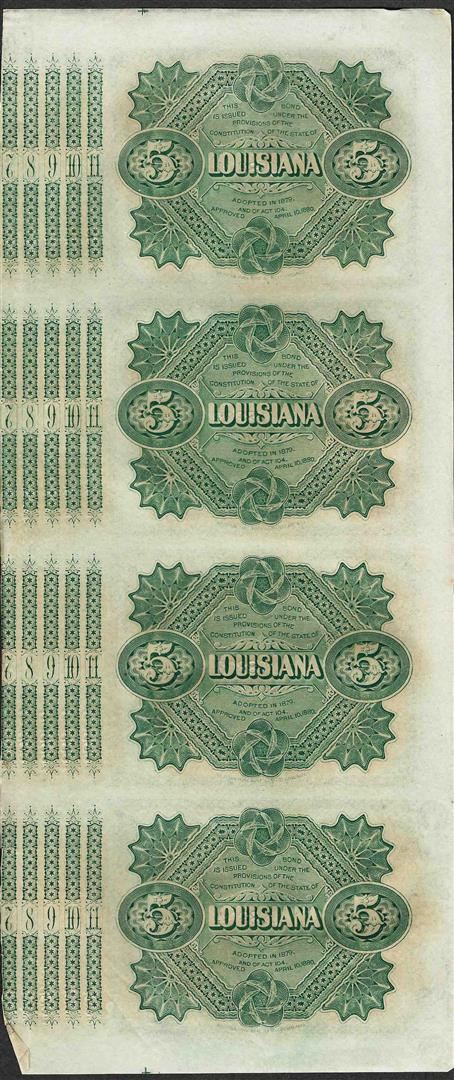 Uncut Sheet of (4) State of Louisiana Baby Bond Obsolete Notes