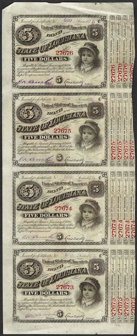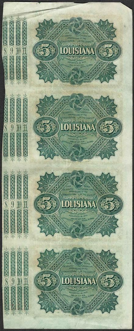 Uncut Sheet of (4) State of Louisiana Baby Bond Obsolete Notes