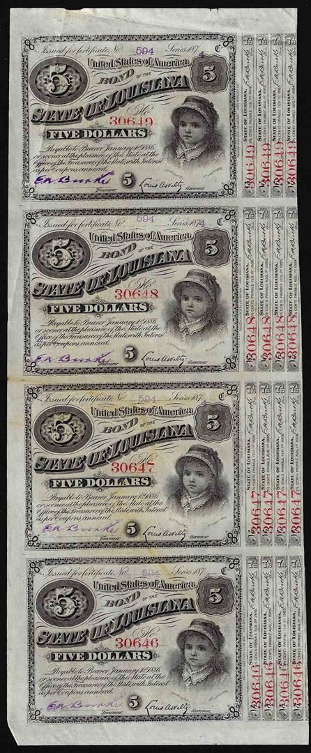 Uncut Sheet of (4) State of Louisiana Baby Bond Obsolete Notes