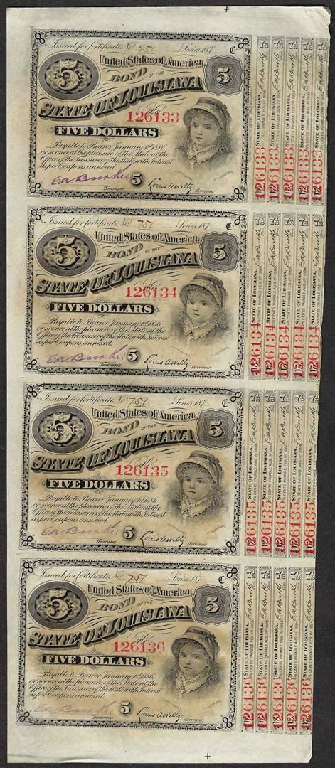 Uncut Sheet of (4) State of Louisiana Baby Bond Obsolete Notes