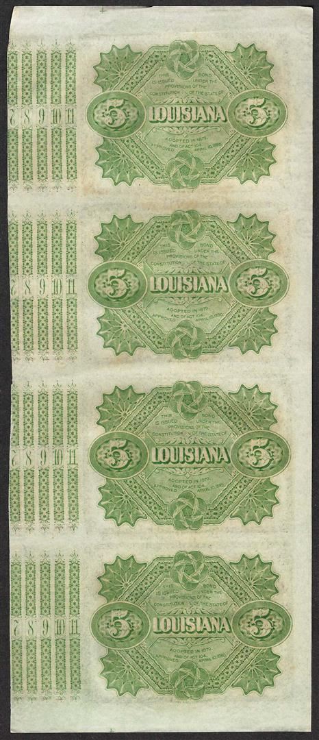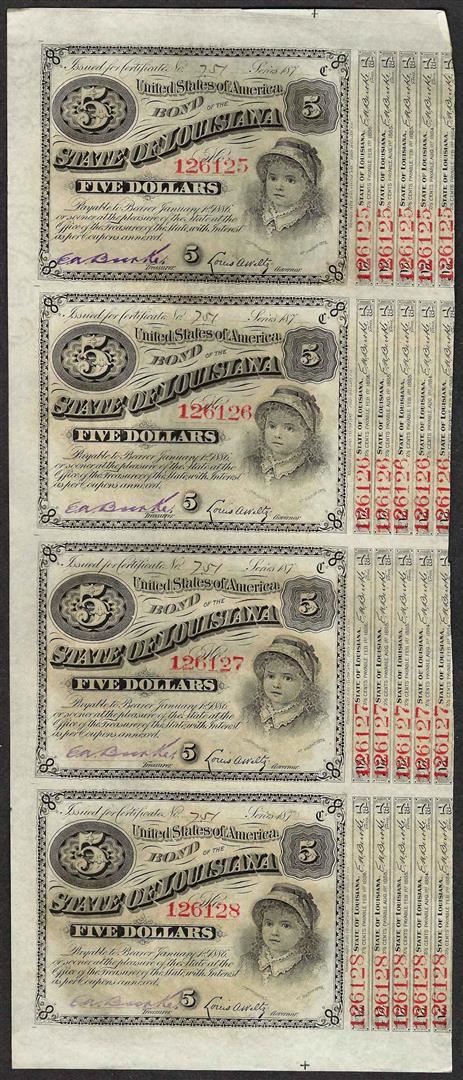 Uncut Sheet of (4) State of Louisiana Baby Bond Obsolete Notes