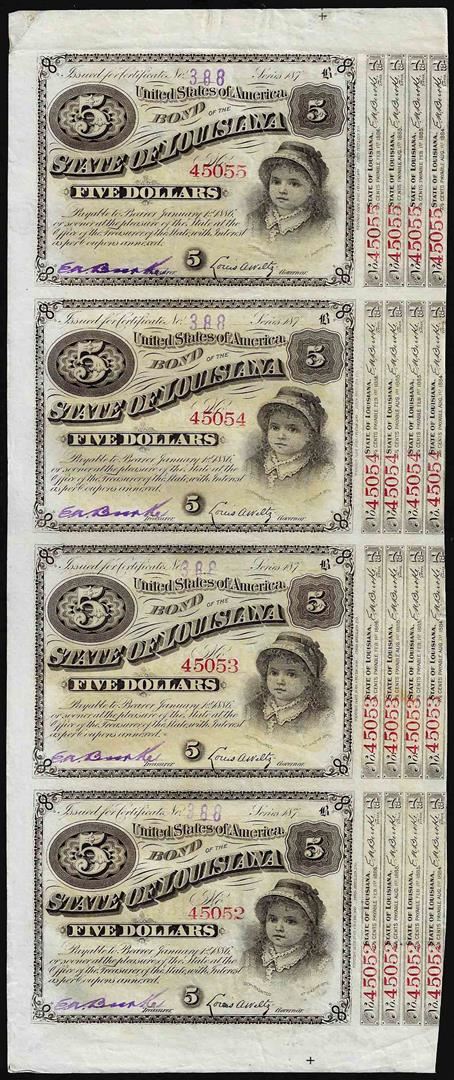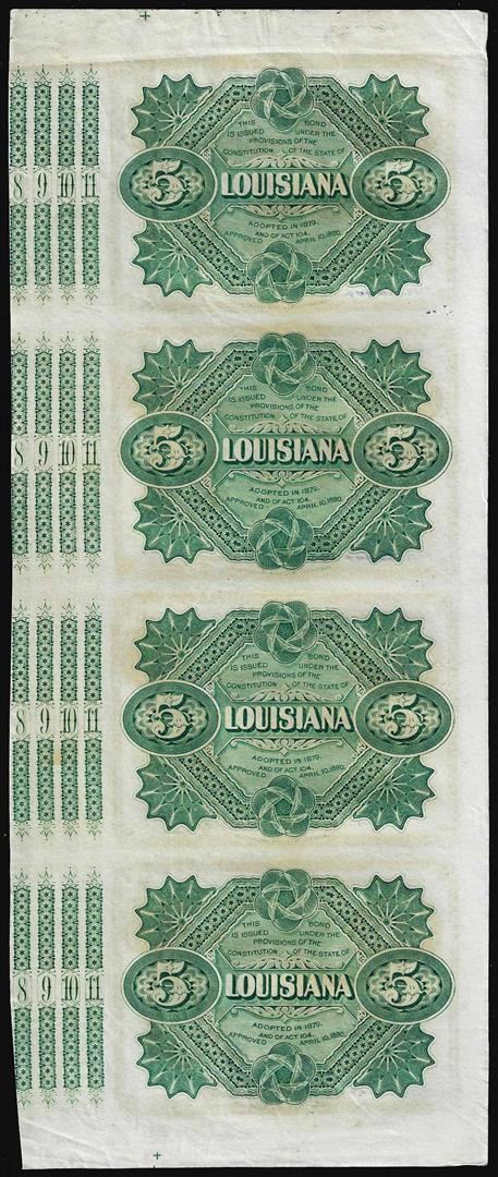 Uncut Sheet of (4) State of Louisiana Baby Bond Obsolete Notes
