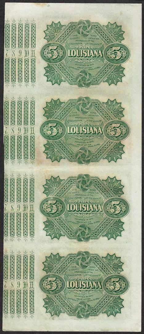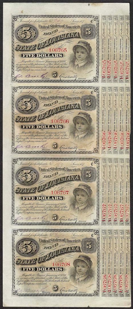 Uncut Sheet of (4) State of Louisiana Baby Bond Obsolete Notes