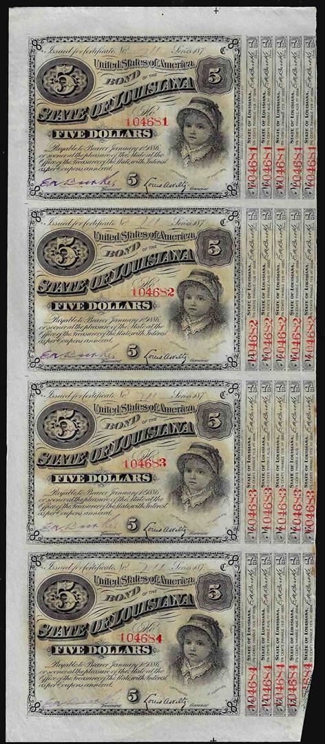 Uncut Sheet of (4) State of Louisiana Baby Bond Obsolete Notes