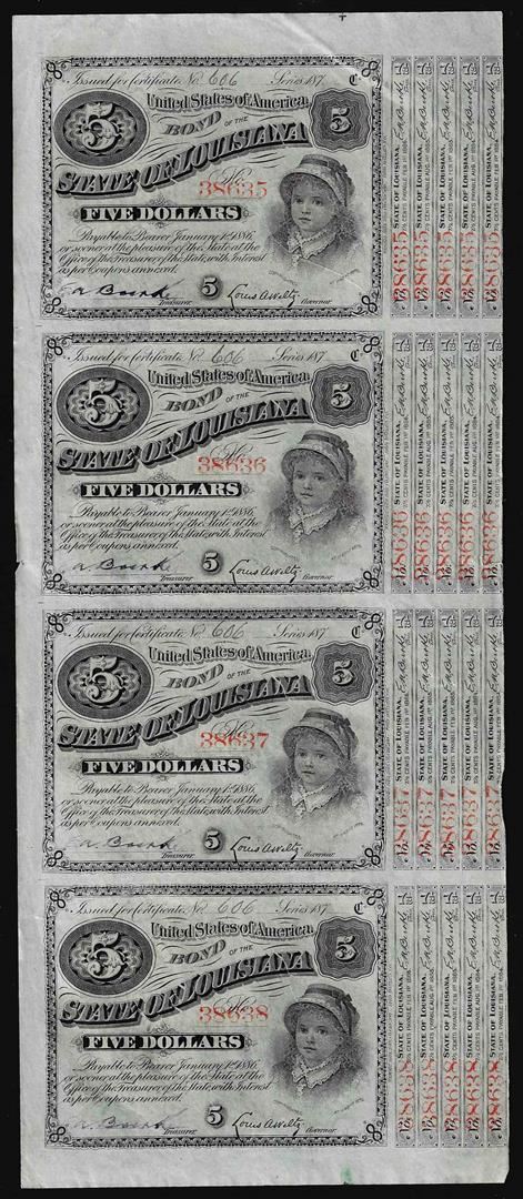 Uncut Sheet of (4) State of Louisiana Baby Bond Obsolete Notes