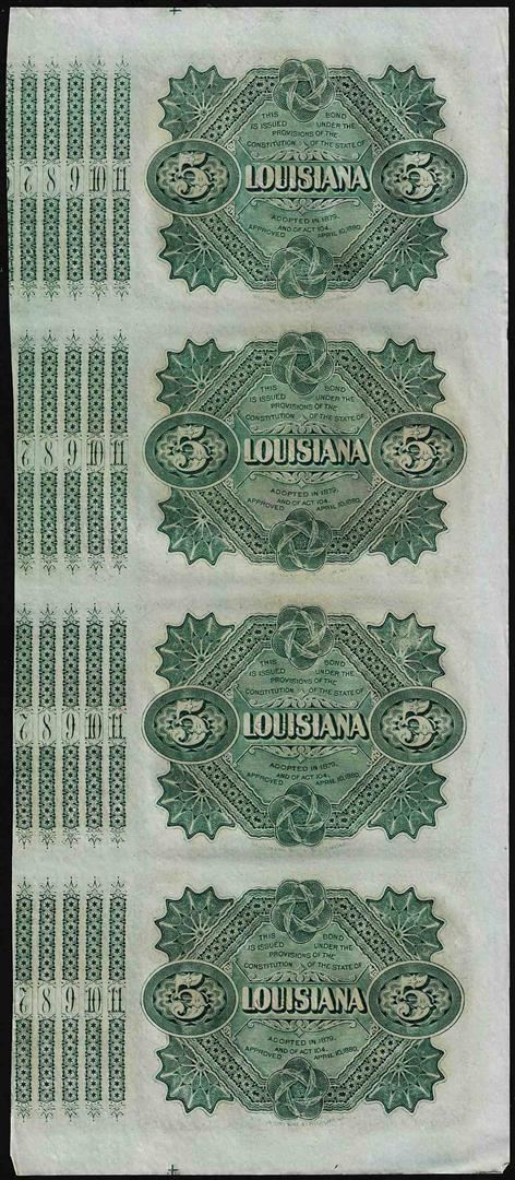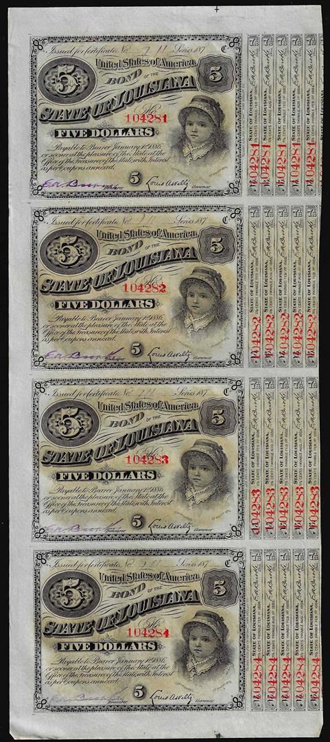 Uncut Sheet of (4) State of Louisiana Baby Bond Obsolete Notes