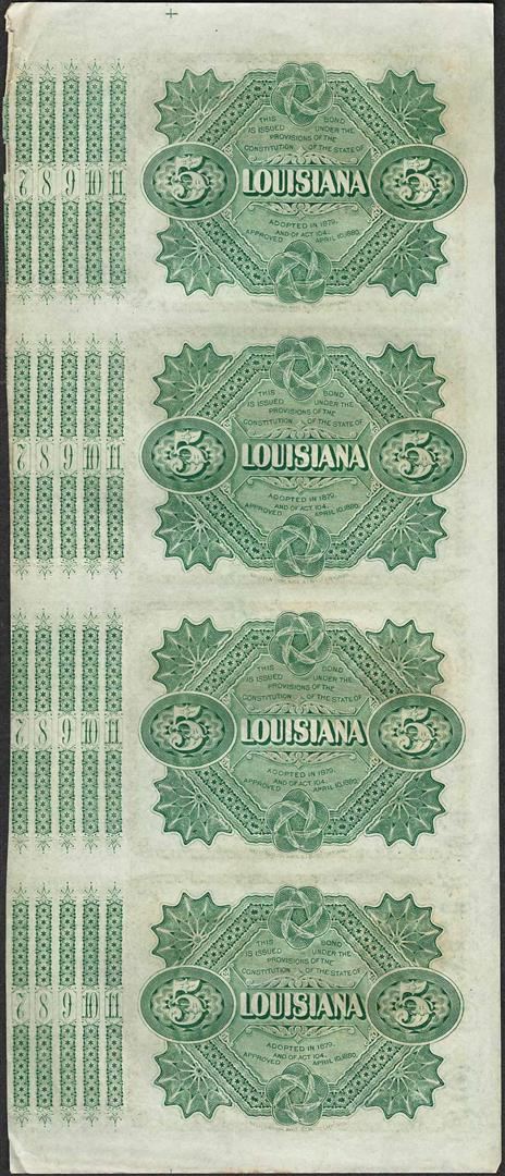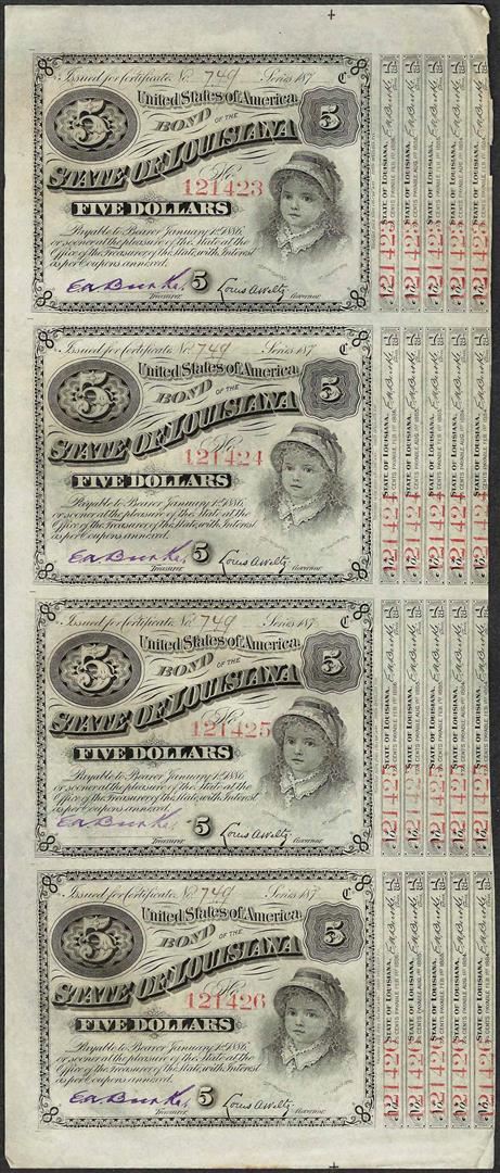 Uncut Sheet of (4) State of Louisiana Baby Bond Obsolete Notes
