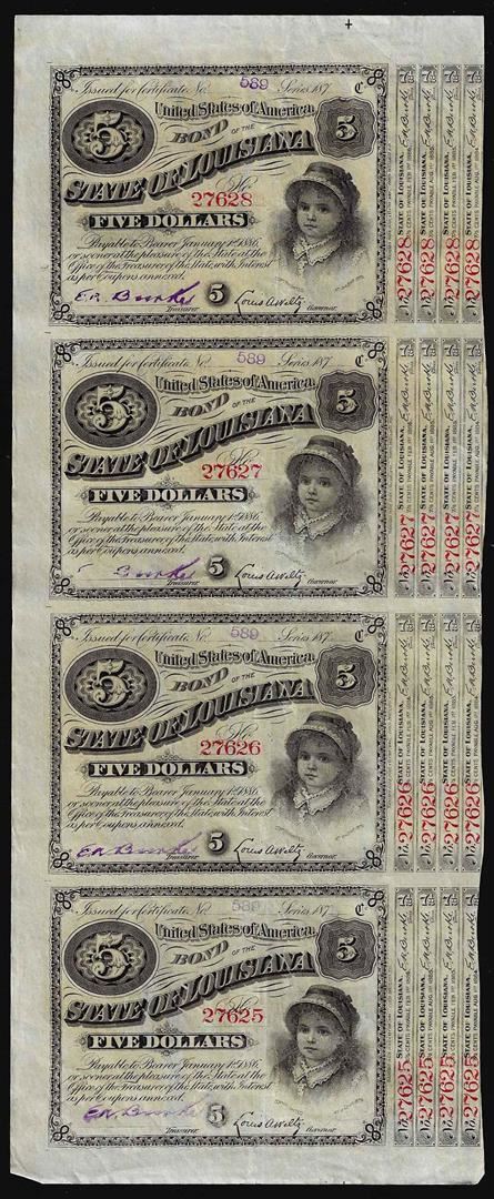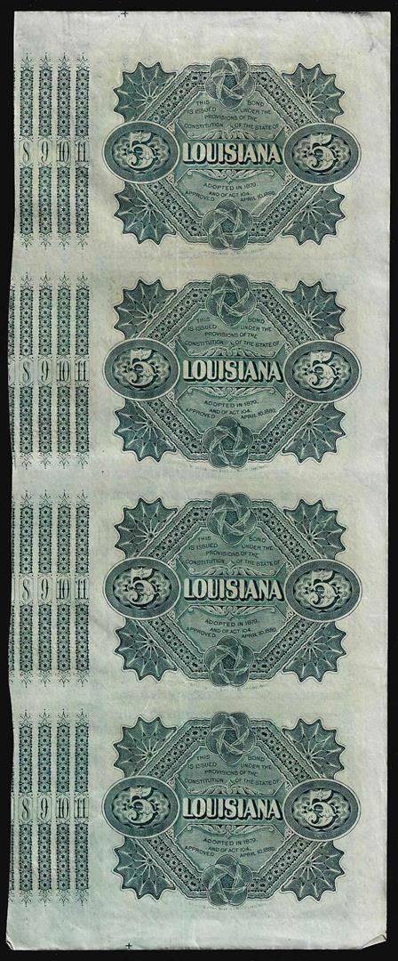 Uncut Sheet of (4) State of Louisiana Baby Bond Obsolete Notes