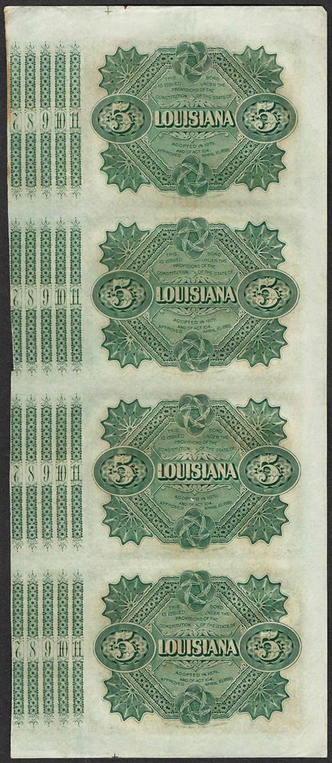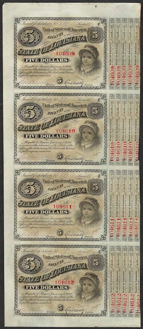 Uncut Sheet of (4) State of Louisiana Baby Bond Obsolete Notes