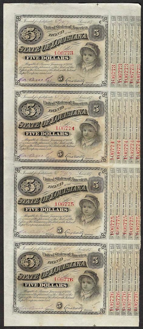 Uncut Sheet of (4) State of Louisiana Baby Bond Obsolete Notes