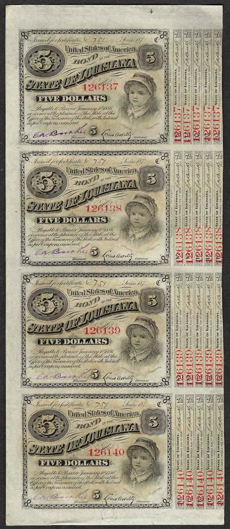 Uncut Sheet of (4) State of Louisiana Baby Bond Obsolete Notes