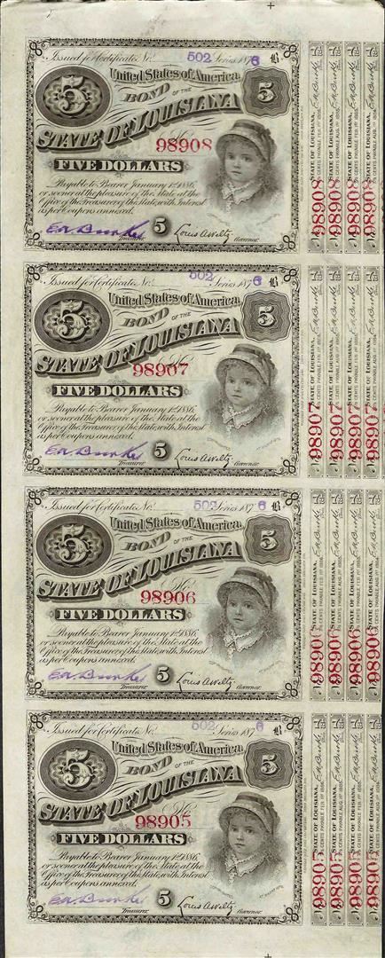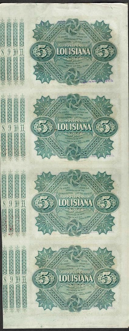 Uncut Sheet of (4) State of Louisiana Baby Bond Obsolete Notes