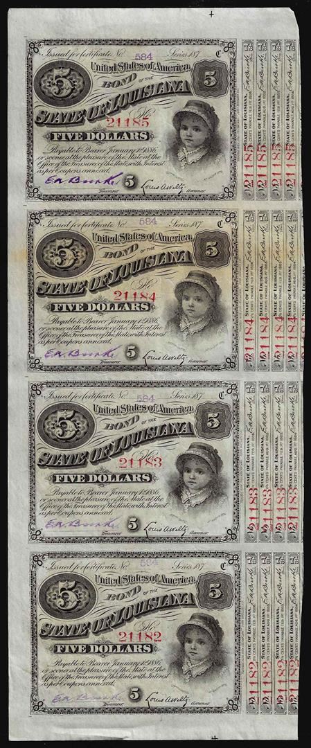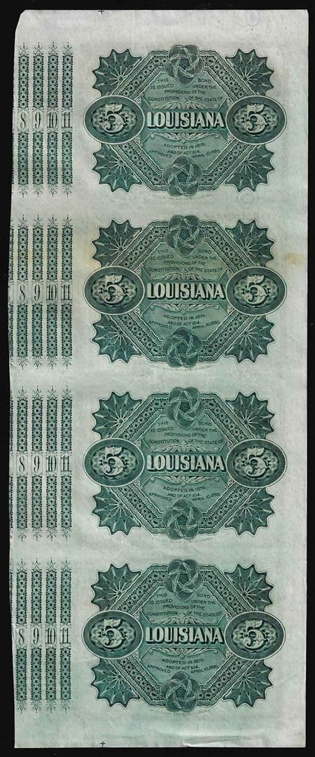 Uncut Sheet of (4) State of Louisiana Baby Bond Obsolete Notes