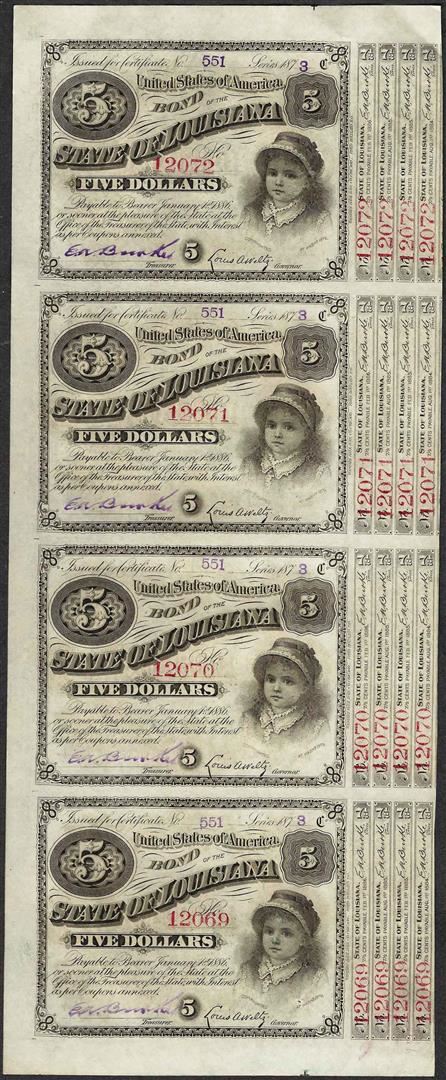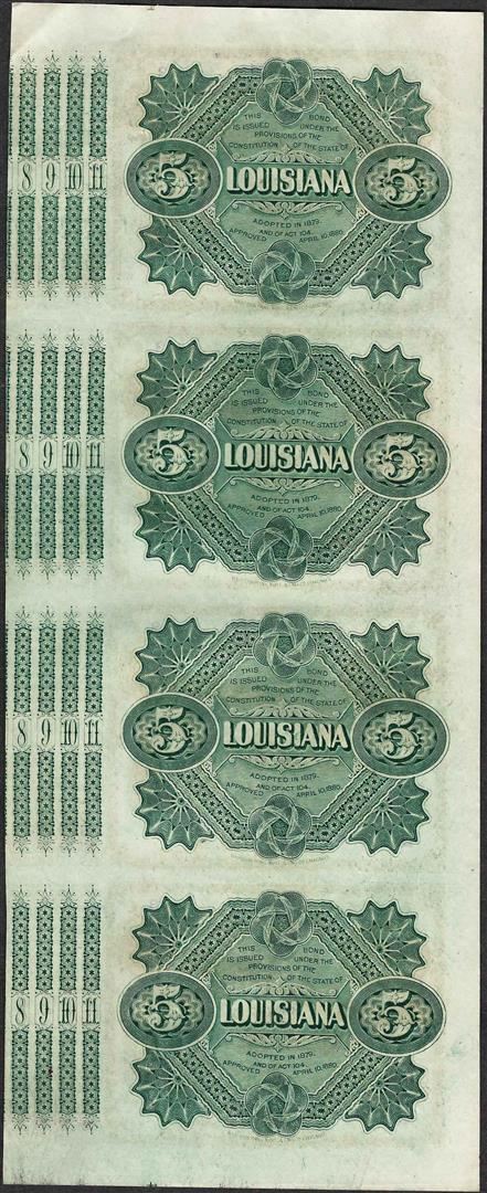 Uncut Sheet of (4) State of Louisiana Baby Bond Obsolete Notes