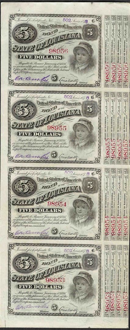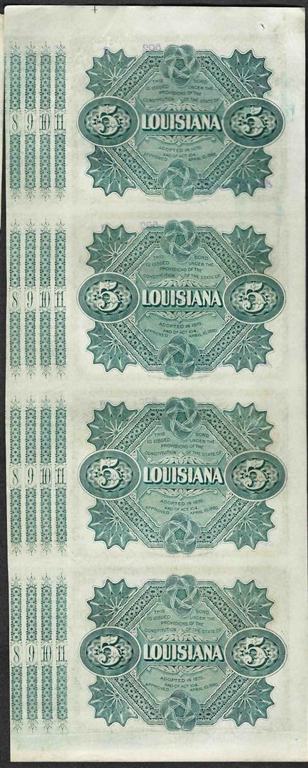 Uncut Sheet of (4) State of Louisiana Baby Bond Obsolete Notes