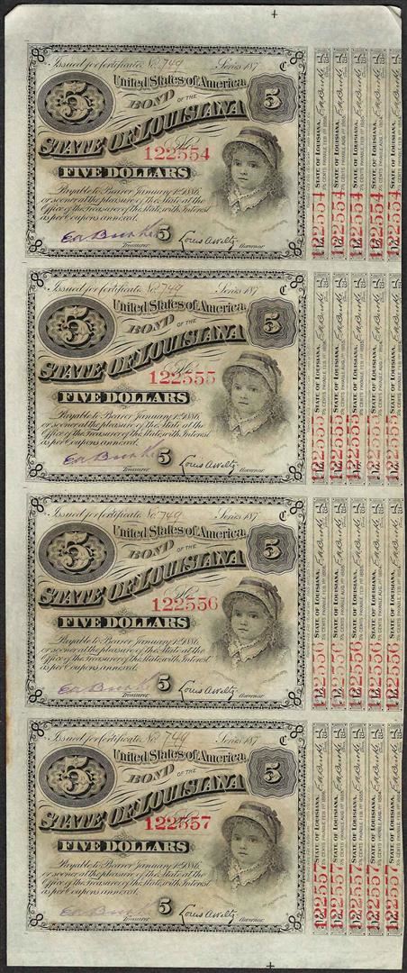 Uncut Sheet of (4) State of Louisiana Baby Bond Obsolete Notes