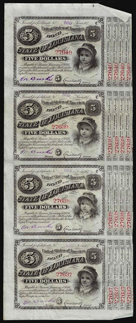 Uncut Sheet of (4) State of Louisiana Baby Bond Obsolete Notes