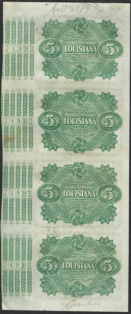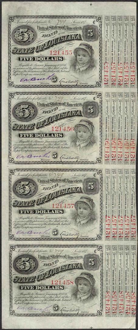 Uncut Sheet of (4) State of Louisiana Baby Bond Obsolete Notes