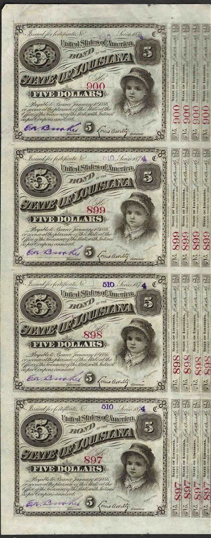 Uncut Sheet of (4) State of Louisiana Baby Bond Obsolete Notes