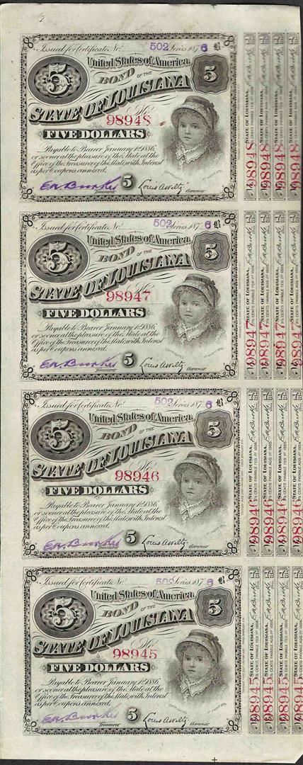 Uncut Sheet of (4) State of Louisiana Baby Bond Obsolete Notes