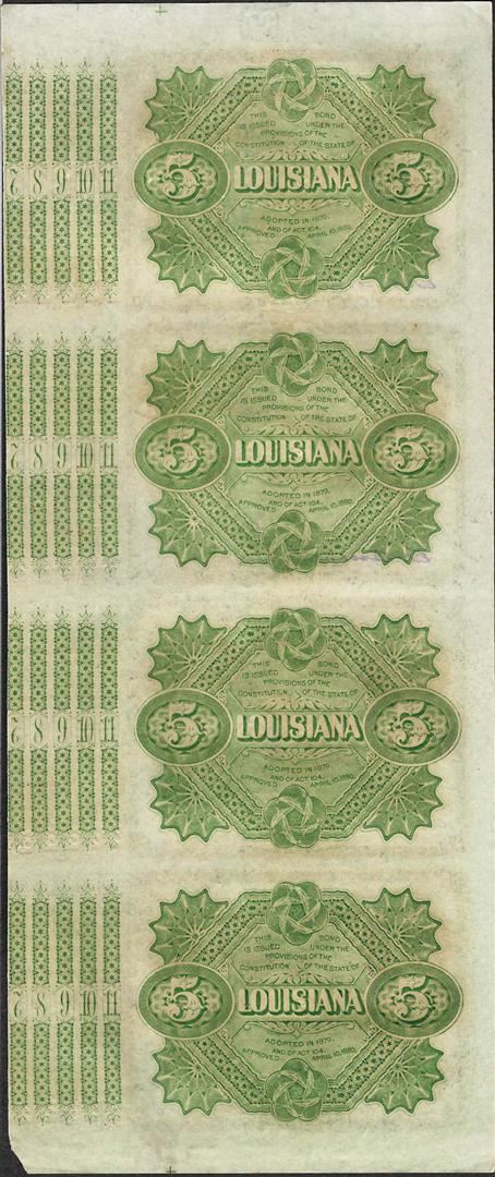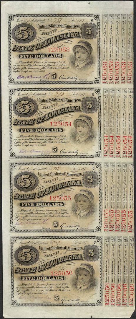Uncut Sheet of (4) State of Louisiana Baby Bond Obsolete Notes