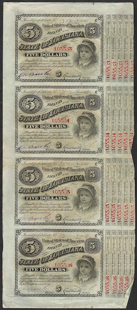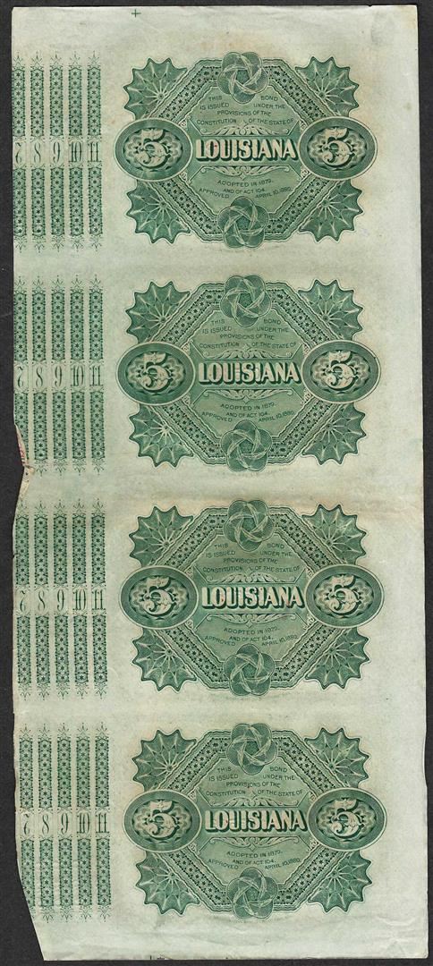 Uncut Sheet of (4) State of Louisiana Baby Bond Obsolete Notes