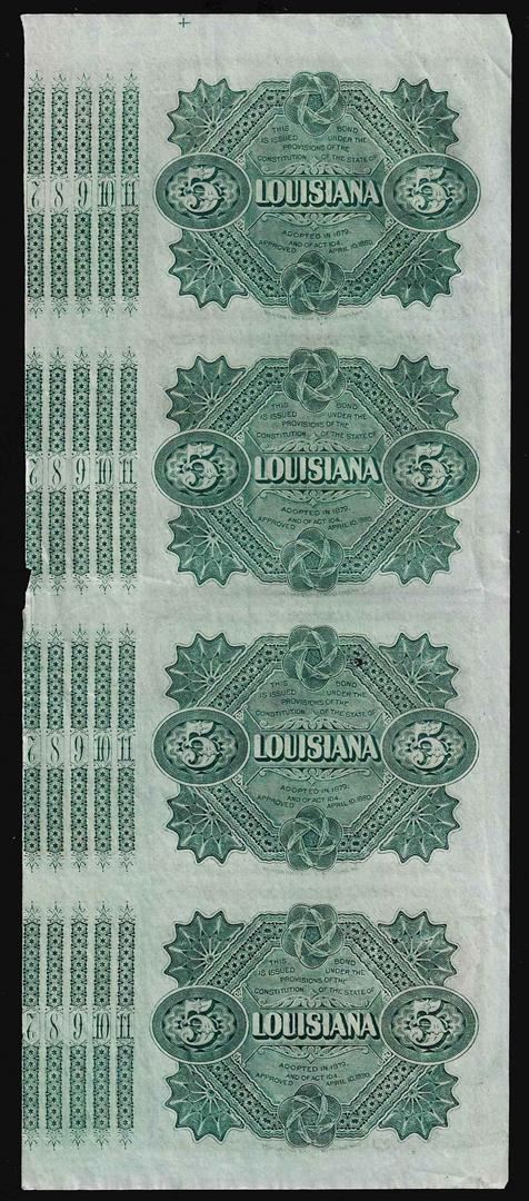 Uncut Sheet of (4) State of Louisiana Baby Bond Obsolete Notes