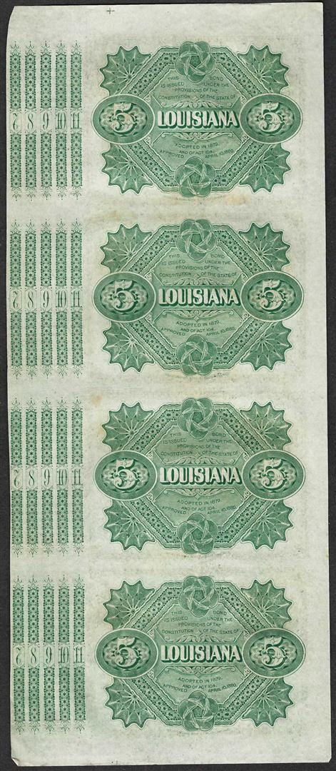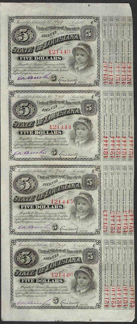 Uncut Sheet of (4) State of Louisiana Baby Bond Obsolete Notes