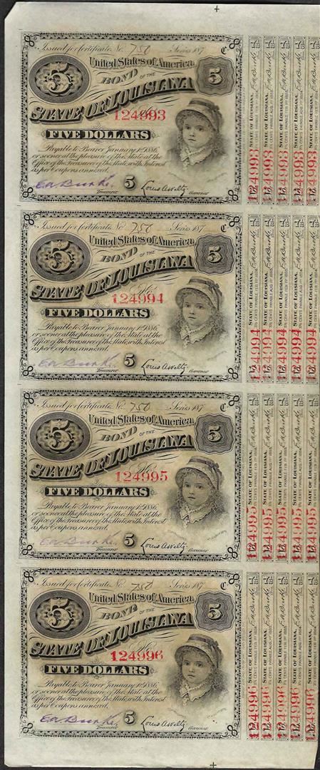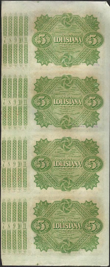 Uncut Sheet of (4) State of Louisiana Baby Bond Obsolete Notes