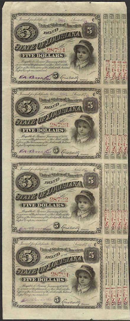 Uncut Sheet of (4) State of Louisiana Baby Bond Obsolete Notes
