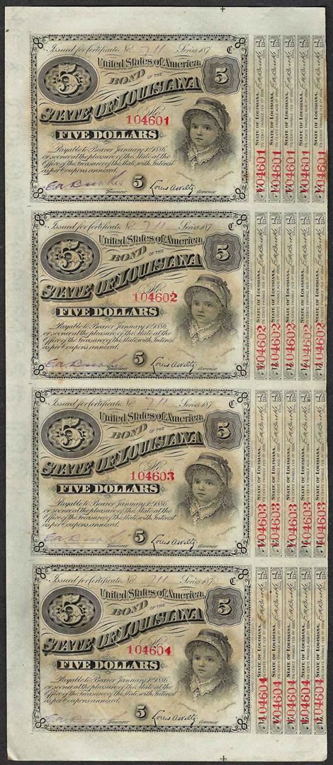 Uncut Sheet of (4) State of Louisiana Baby Bond Obsolete Notes