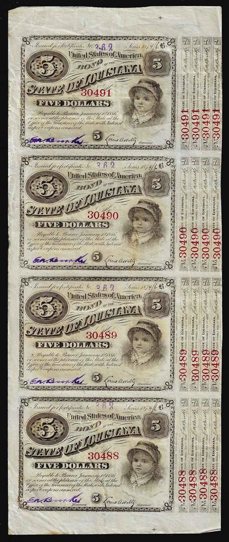 Uncut Sheet of (4) State of Louisiana Baby Bond Obsolete Notes