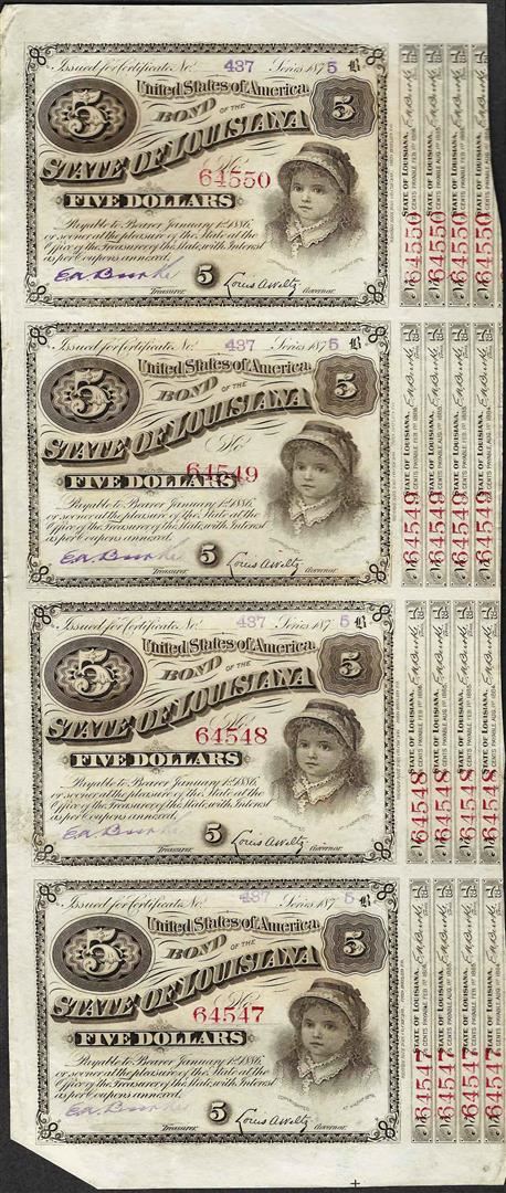 Uncut Sheet of (4) State of Louisiana Baby Bond Obsolete Notes