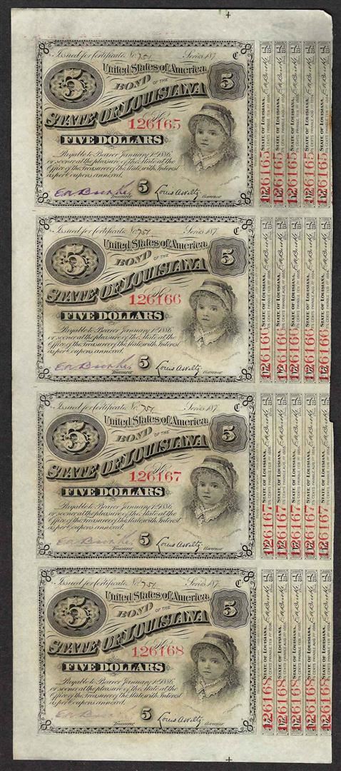 Uncut Sheet of (4) State of Louisiana Baby Bond Obsolete Notes