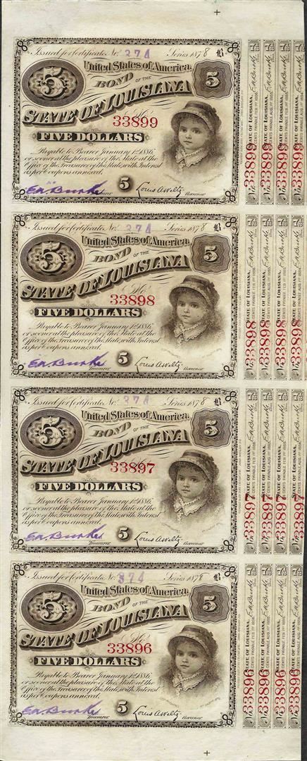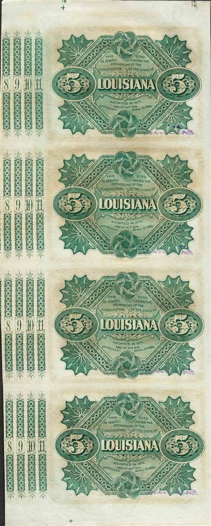 Uncut Sheet of (4) State of Louisiana Baby Bond Obsolete Notes
