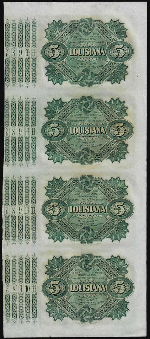 Uncut Sheet of (4) State of Louisiana Baby Bond Obsolete Notes