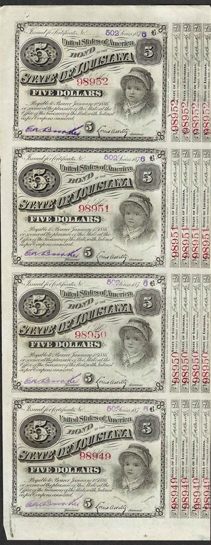 Uncut Sheet of (4) State of Louisiana Baby Bond Obsolete Notes