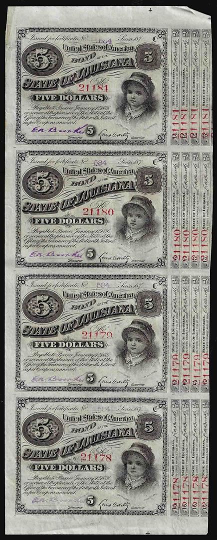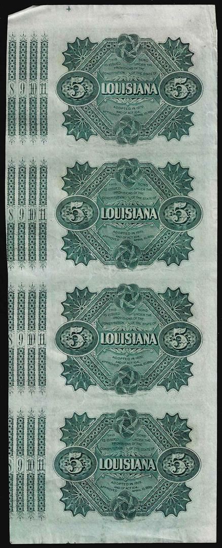 Uncut Sheet of (4) State of Louisiana Baby Bond Obsolete Notes