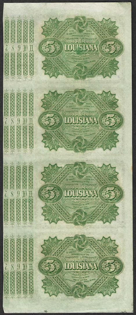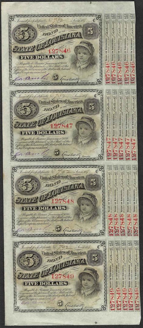 Uncut Sheet of (4) State of Louisiana Baby Bond Obsolete Notes