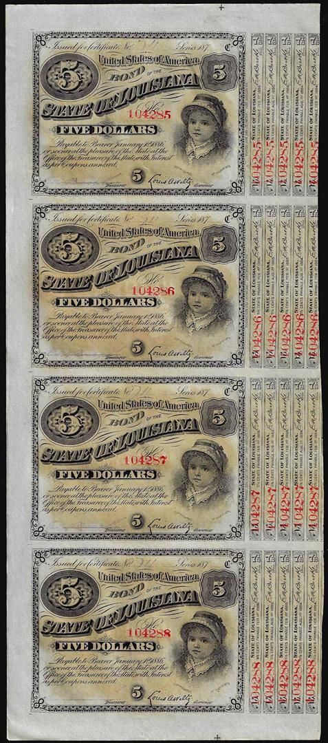 Uncut Sheet of (4) State of Louisiana Baby Bond Obsolete Notes
