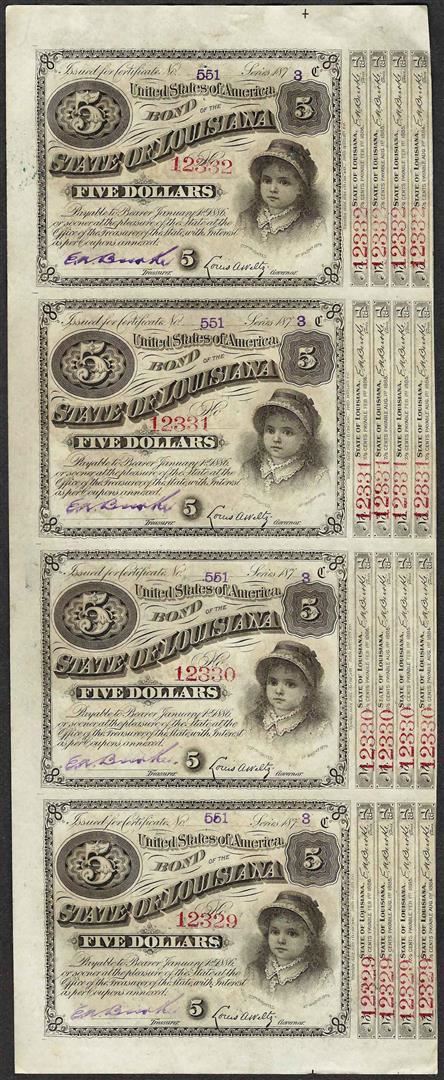 Uncut Sheet of (4) State of Louisiana Baby Bond Obsolete Notes